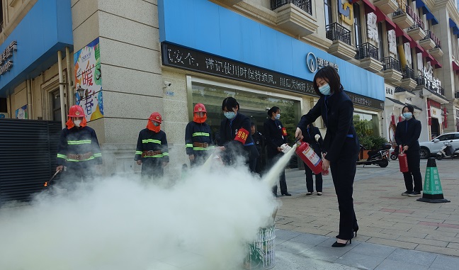 隨著警報(bào)聲響起,應(yīng)急疏散演練正式開(kāi)始,客戶中心工作人員在疏散組的引導(dǎo)下捂住口鼻、彎下腰,有序撤離出客戶中心大廳。從拉響警報(bào)至所有人員安全撤離至演練集合點(diǎn),前后僅用時(shí)兩分二十秒。隨后,參加演練人員又在演練總指揮的指導(dǎo)下,輪流站在火源上風(fēng)位置,左手緊握滅火器鴨舌把并在提起后用力向下壓把手,右手把拉環(huán)迅速抽出后將噴嘴對(duì)準(zhǔn)火源進(jìn)行噴灑。