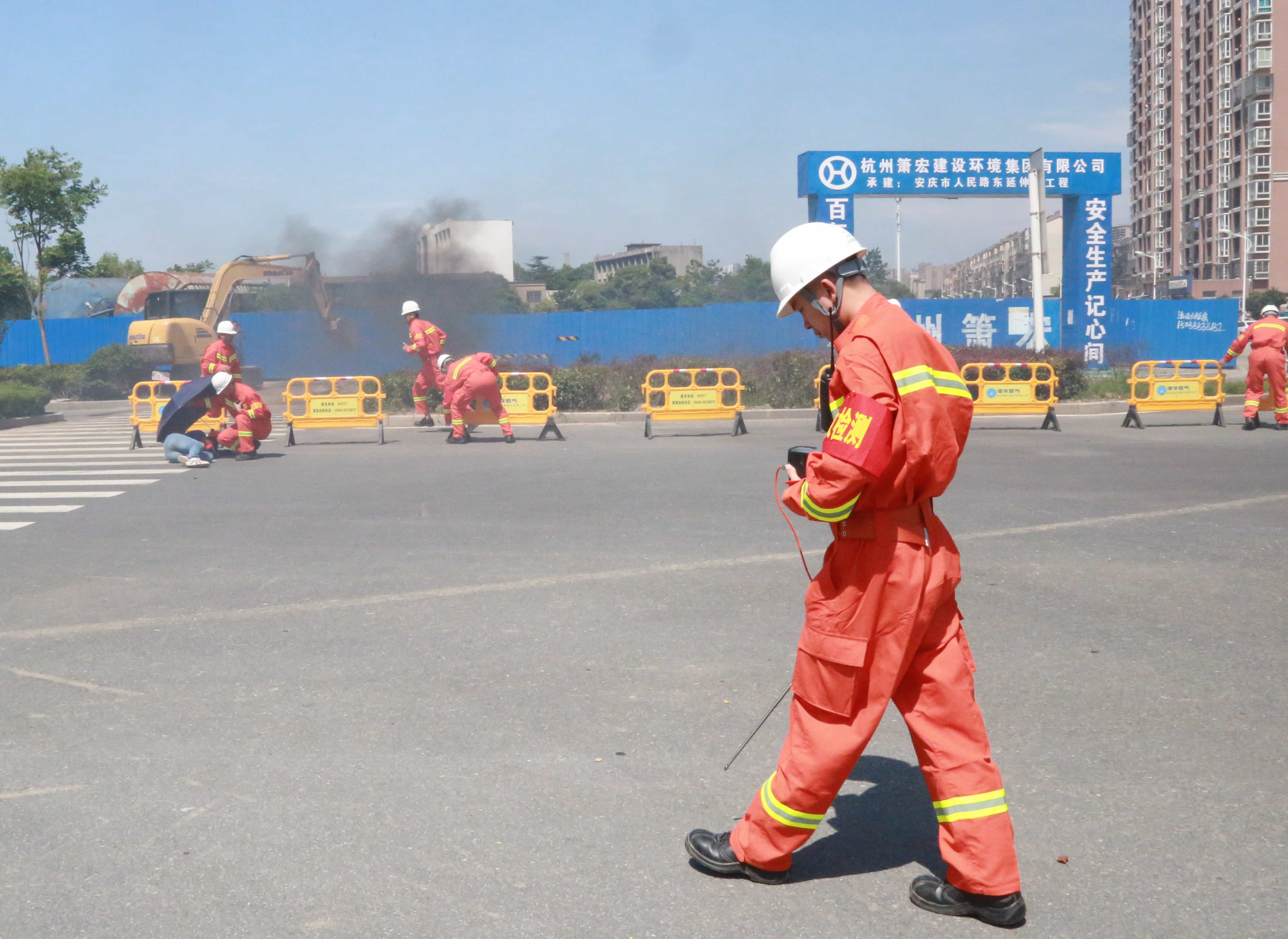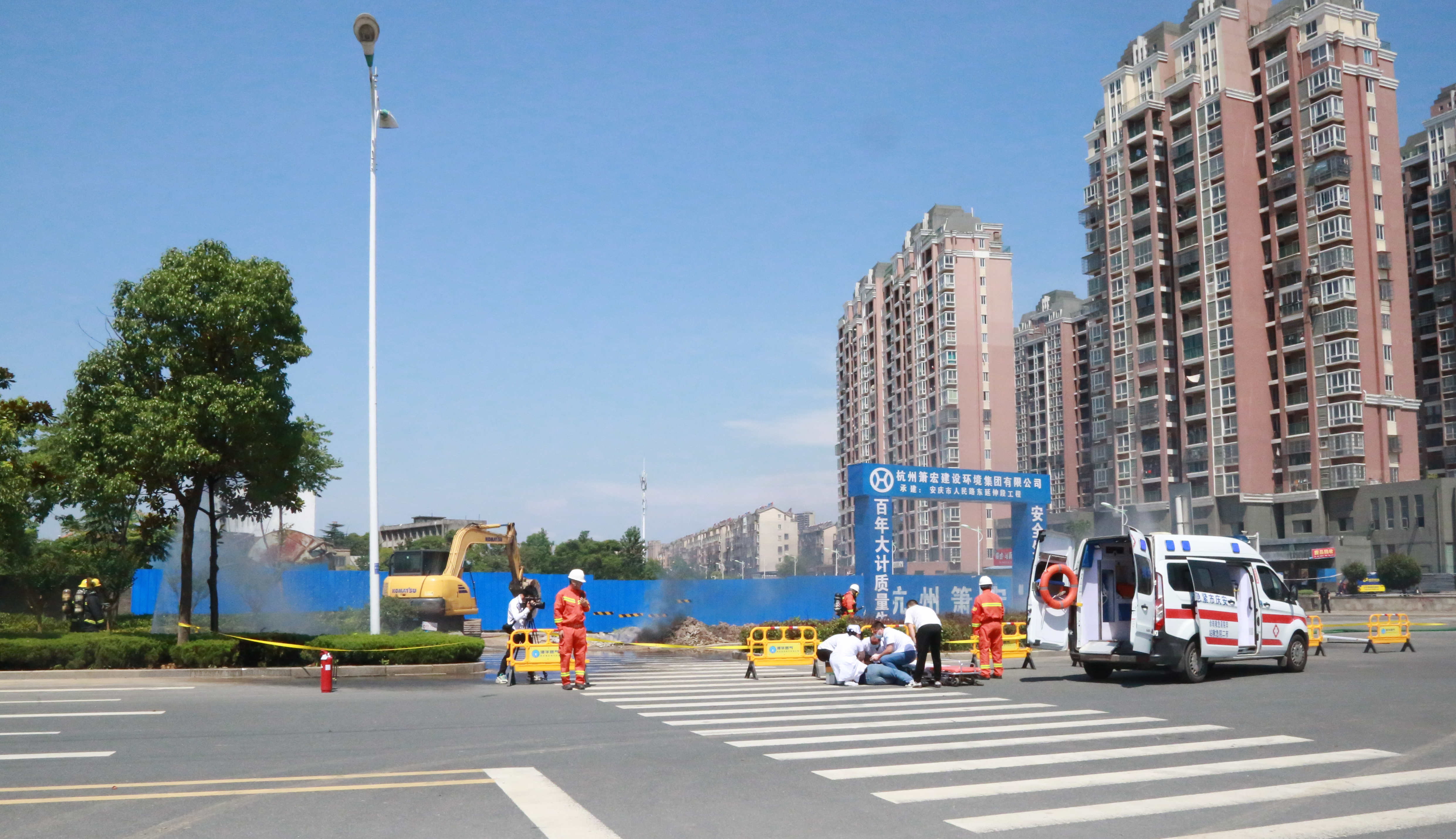 本次演練現場模擬了因第三方施工單位違章作業(yè)挖破安慶市迎江區(qū)獨秀大道水岸花都小區(qū)南側(獨秀大道與華中東路交叉口南行約200米)的地下中壓天然氣管道,引發(fā)天然氣泄漏后遇火源發(fā)生爆燃,造成多名人員受傷,同時泄漏的燃氣還竄至附近水岸花都小區(qū)市政管網,隨時可能引發(fā)爆炸事故,威脅小區(qū)約3000戶居民及商戶生命財產安全。接到報警電話后,安慶港華燃氣與市公安局、市消防救援支隊、市衛(wèi)健委、迎江區(qū)政府、龍獅橋鄉(xiāng)政府等單位及時組織力量趕赴現場,并按照《安慶市城市燃氣事故應急預案》要求協(xié)同配合,有序開展現場警戒、群眾疏散、傷員救治、消防救援、搶險搶修等應急處置工作。