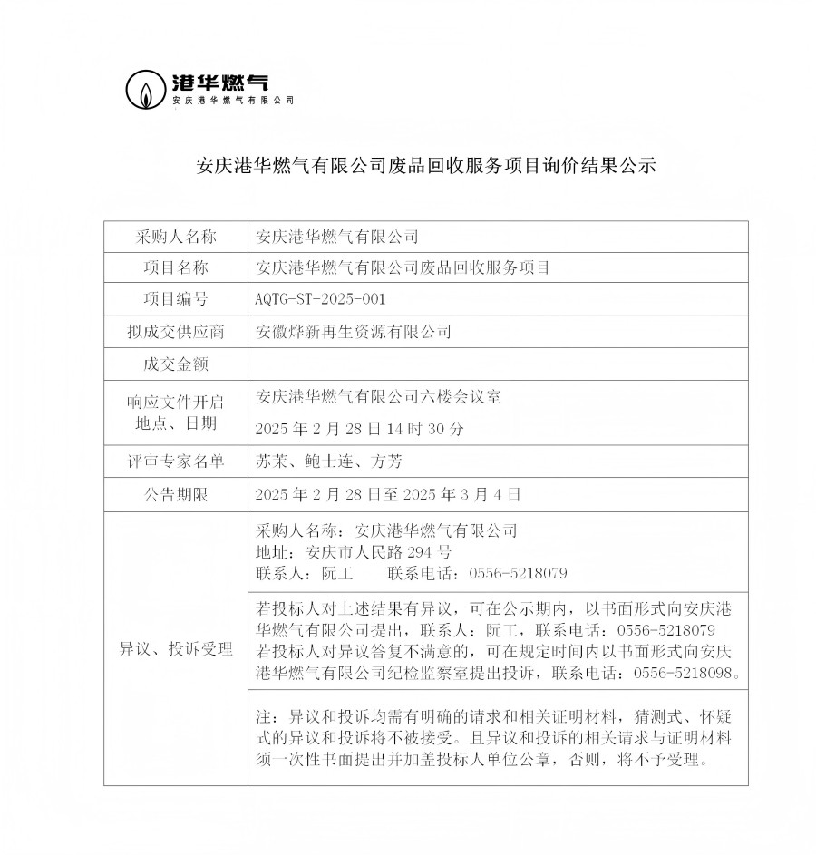 安慶港華燃氣有限公司廢品回收服務(wù)項目詢價結(jié)果公示