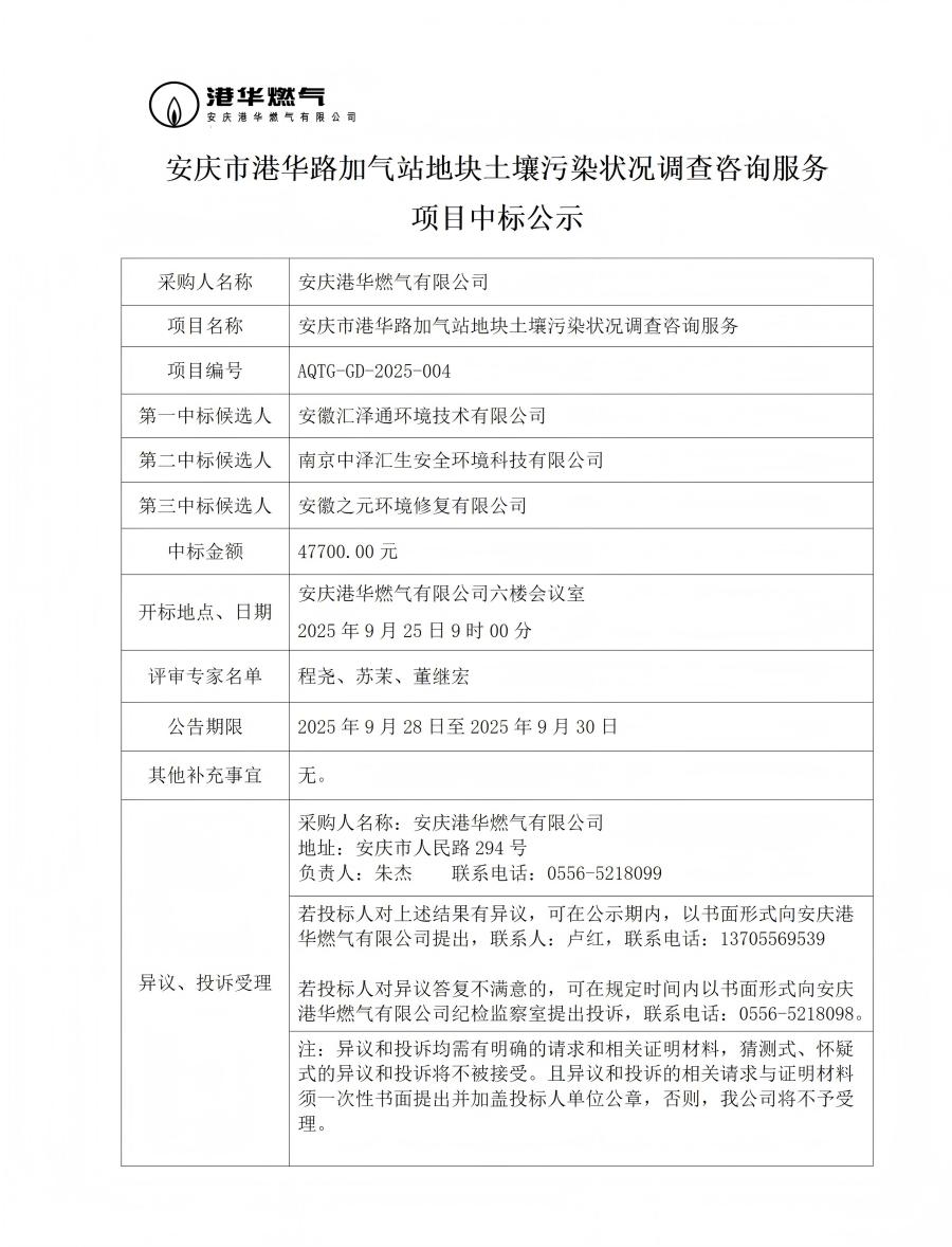 安慶市港華路加氣站地塊土壤污染狀況調(diào)查咨詢服務(wù)項目中標(biāo)公示
