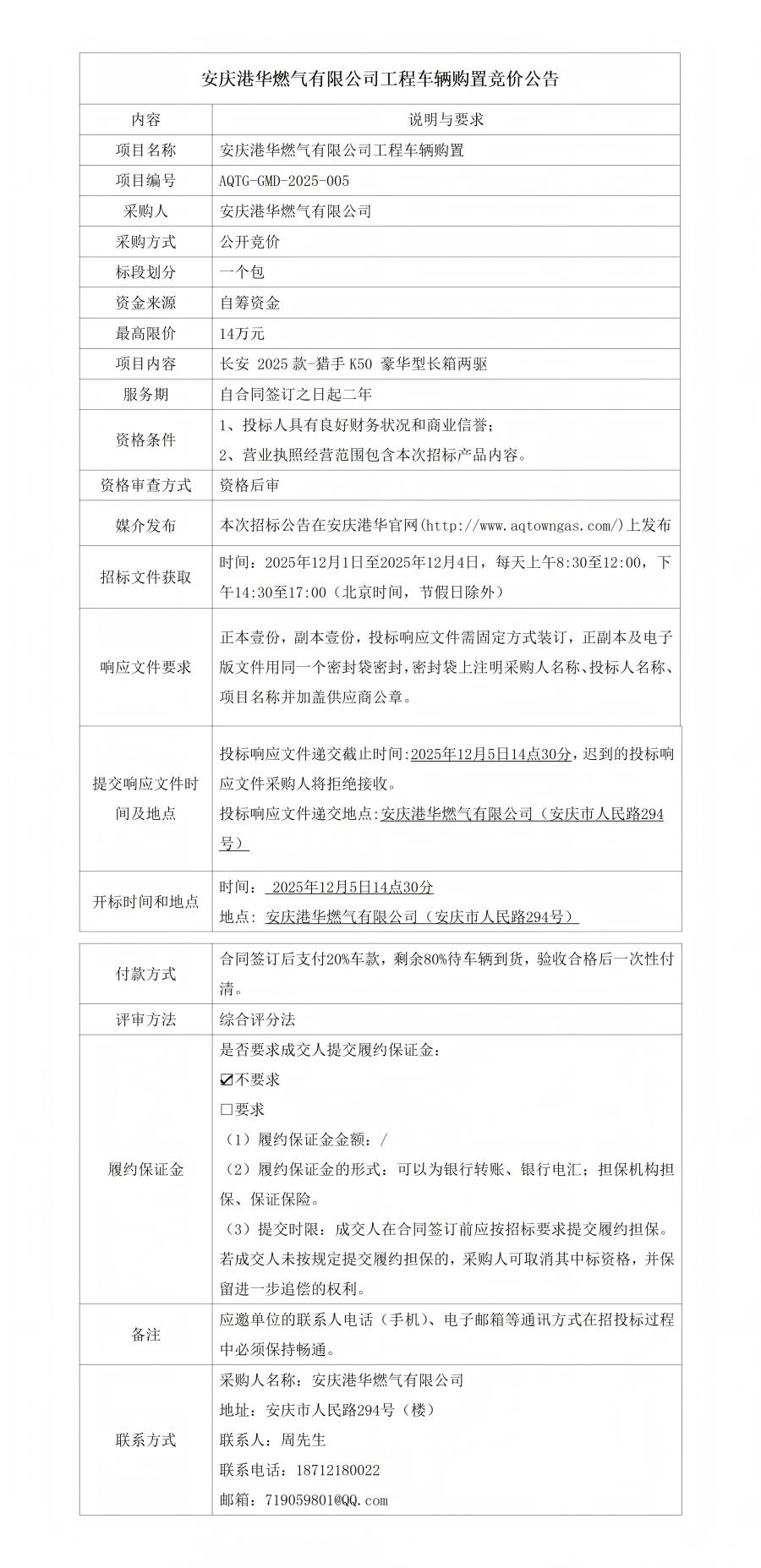 安慶港華燃?xì)庥邢薰竟こ誊囕v購置競價公告