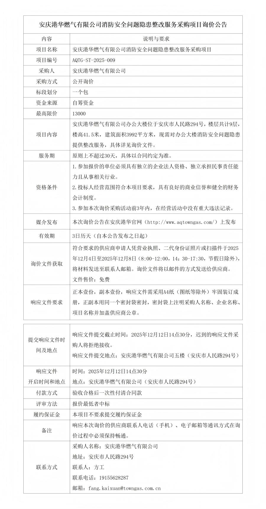 安慶港華燃氣有限公司消防安全問題隱患整改服務(wù)采購項目詢價公告