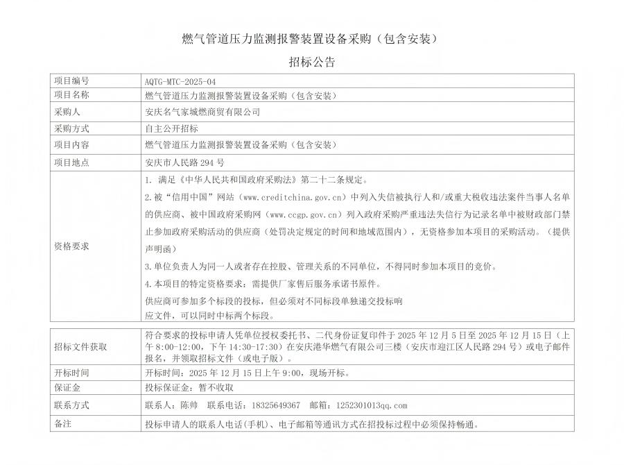 燃?xì)夤艿缐毫ΡO(jiān)測報(bào)警裝置設(shè)備采購(包含安裝)招標(biāo)公告 發(fā)布時(shí)間:2025-12-05    閱讀次數(shù):659次