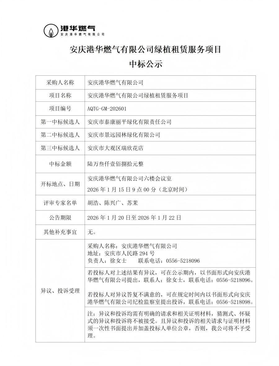 安慶港華燃?xì)庥邢薰揪G植租賃服務(wù)項(xiàng)目中標(biāo)公示 發(fā)布時(shí)間:2026-01-20    閱讀次數(shù):579次